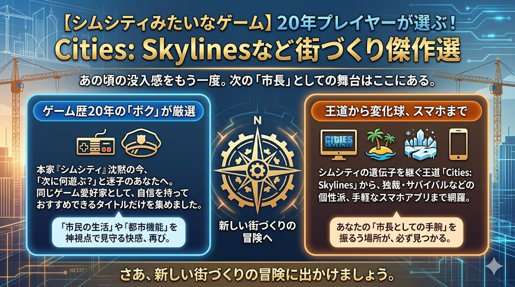 「あの頃、時間を忘れて熱中した『シムシティ』のような没入感を、もう一度味わいたい」 そう思って検索窓にキーワードを打ち込んだあなたへ。 こんにちは、当サイト『ゲームのウラ話』を運営しているsatimoです。 ゲーム歴20年、RPGと同じくらいシミュレ... ゲーム