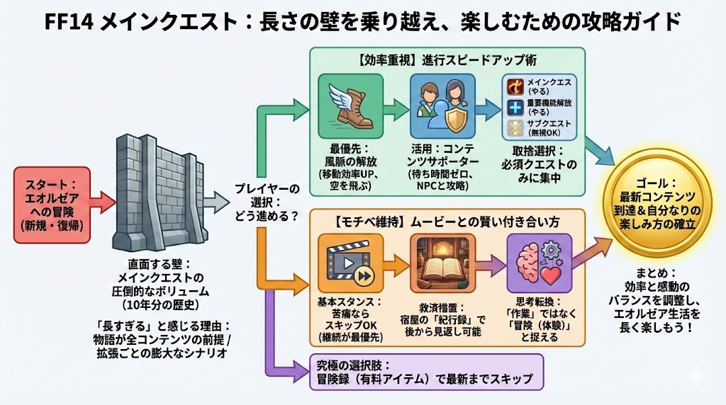 エオルゼアに降り立ったばかりの冒険者、あるいは久しぶりに復帰したプレイヤーが必ずと言っていいほど直面する壁があります。 それが、10年以上の歴史が積み重なった「メインクエストの圧倒的なボリューム」です。 「FF14のメインクエストは長すぎる」と... ジョブ・攻略