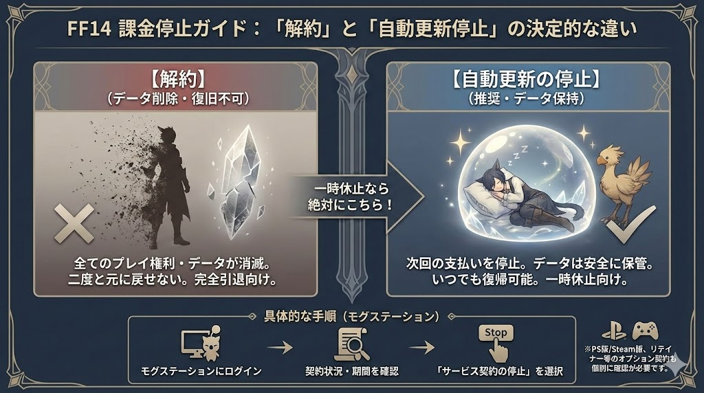 ファイナルファンタジーXIV(FF14)をプレイしていて、「しばらく休止したい」「一度課金を止めたい」と考えるタイミングは、多くの冒険者に訪れるものです。 しかし、いざ手続きをしようとすると、管理画面である「モグステーション」の構造が少し複雑に... その他・ネタ