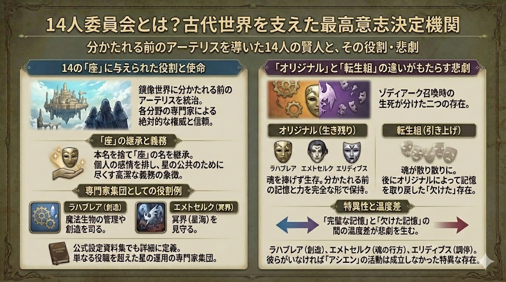 14人委員会とは、鏡像世界に分かたれる前の「アーテリス」において、世界をより良く導くために組織された14人の賢人による統治組織です。