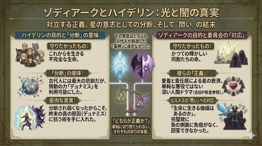 14人委員会が守りたかったのは「かつての輝かしい同胞たちの命」であり、ハイデリンが守りたかったのは「これからを生きる不完全な生命」でした。