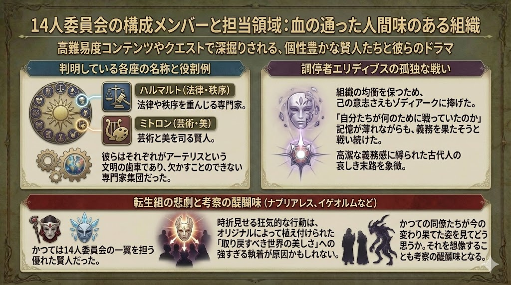 14人委員会には個性豊かなメンバーが揃っており、その多くはエデン零式やパンデモニウムなどの高難易度コンテンツ、あるいはメインクエストの断片的な情報で深掘りされています。