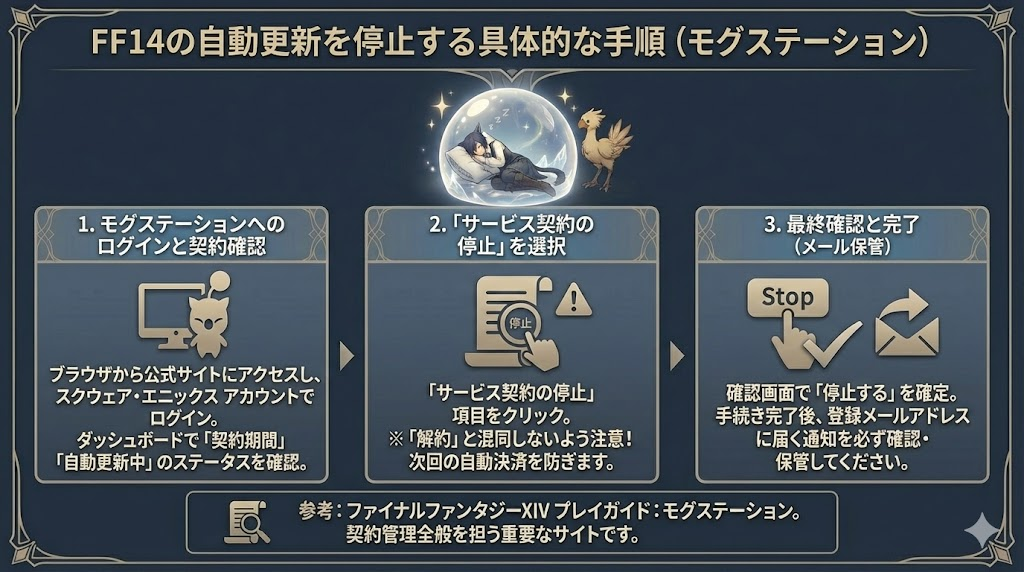 結論からお伝えすると、FF14の課金を止めるには「自動更新の停止」を行うのが最も安全で推奨される方法です。