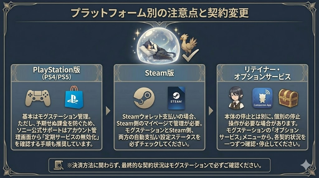 ゲーム本体の利用料金だけでなく、追加のリテイナーや「エオルゼアコンパニオン」のプレミアムオプションを契約している場合も注意が必要です。