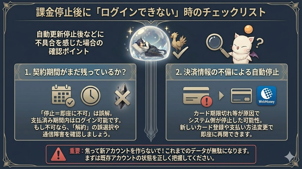 ファイナルファンタジーXIV(FF14)をプレイしていて、「しばらく休止したい」「一度課金を止めたい」と考えるタイミングは、多くの冒険者に訪れるものです。