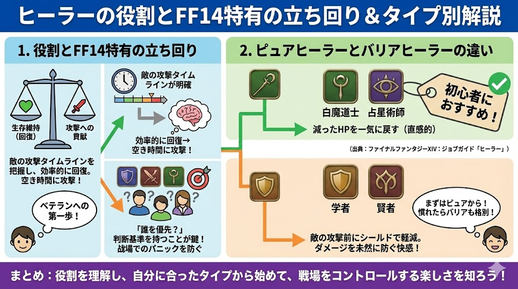 実際に、スクウェア・エニックスの公式ジョブガイドにおいても、ヒーラーは「ピュアヒーラー」と「バリアヒーラー」の2つの役割(ロール内区分)として明記されており、それぞれのジョブがどちらの特性を持つかが定義されています。