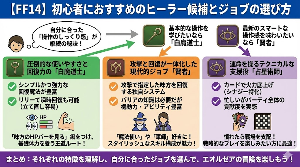 結論として、最も基本的な操作を学びたいなら白魔道士、最新のスマートな操作感を味わいたいなら賢者が適しています。