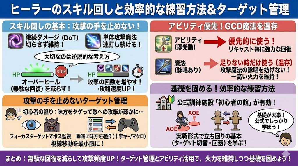 ヒーラーとしての立ち回りの基本(ターゲットの切り替えや範囲攻撃の避け方など)を、実戦形式のギミックを通して公式に学ぶことができます。