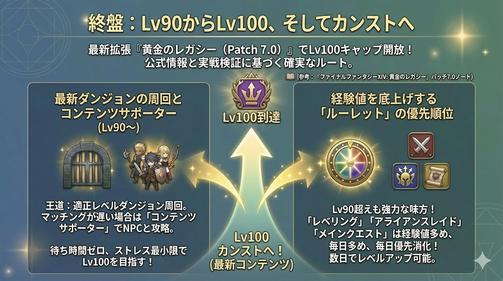 経験値ブーストを忘れず、自分に合ったルーレットやダンジョン、ボズヤなどのコンテンツを組み合わせることで、レベル90まで、その先の100までの道のりは驚くほどスムーズになります。