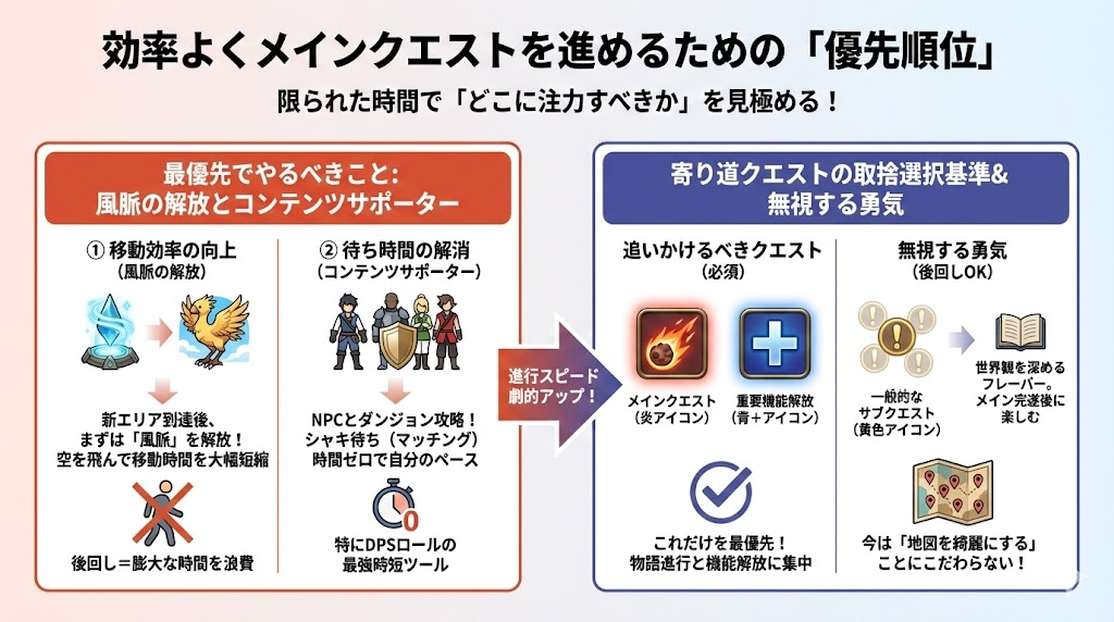 この記事では、メインクエストを効率よく進めるための具体的な優先順位や、議論の的になりやすいムービースキップの賢い付き合い方について、一人のプレイヤーとしての生の声を交えて解説します。