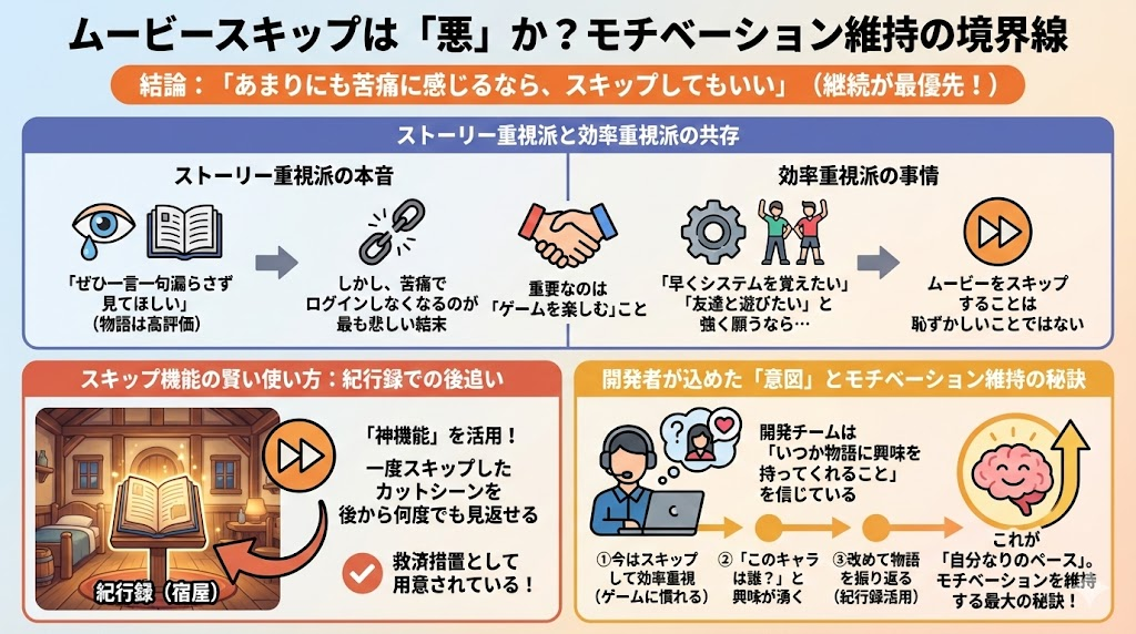 もし、あなたが「今はとにかくシステムを覚えたい」「早く友達とレイドに行きたい」と強く願っているなら、ムービーをスキップして進めることは恥ずかしいことではありません。