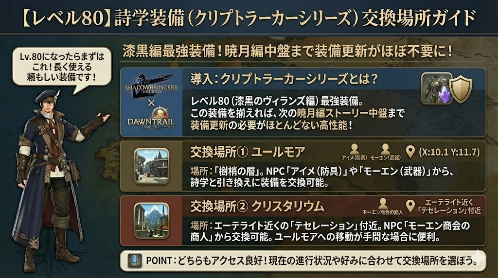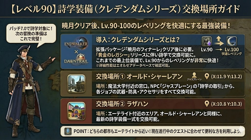 本記事では、レベル50から90までの詩学装備の交換場所を、もっともアクセスしやすい地点に絞って詳しくまとめました。