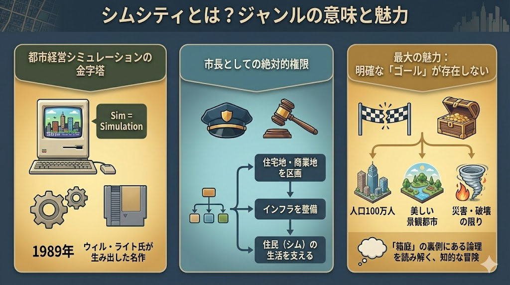 タイトルの「Sim」は「Simulation(シミュレーション)」を意味しており、プレイヤーは市長という絶対的な権限を持って、住宅地や商業地を区画し、インフラを整備し、住民(シム)たちの生活を支えます。