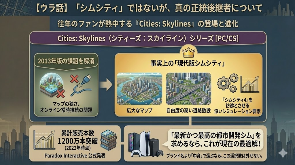 もしあなたがPCや最新の家庭用ゲーム機(PS5/Xboxなど)をお持ちで、「最新かつ最高の都市開発シム」を遊びたいのであれば、本家シムシティシリーズではなく、『Cities: Skylines』またはその続編である『Cities: Skylines II』を選ぶのが、現在の最適解かもしれません。