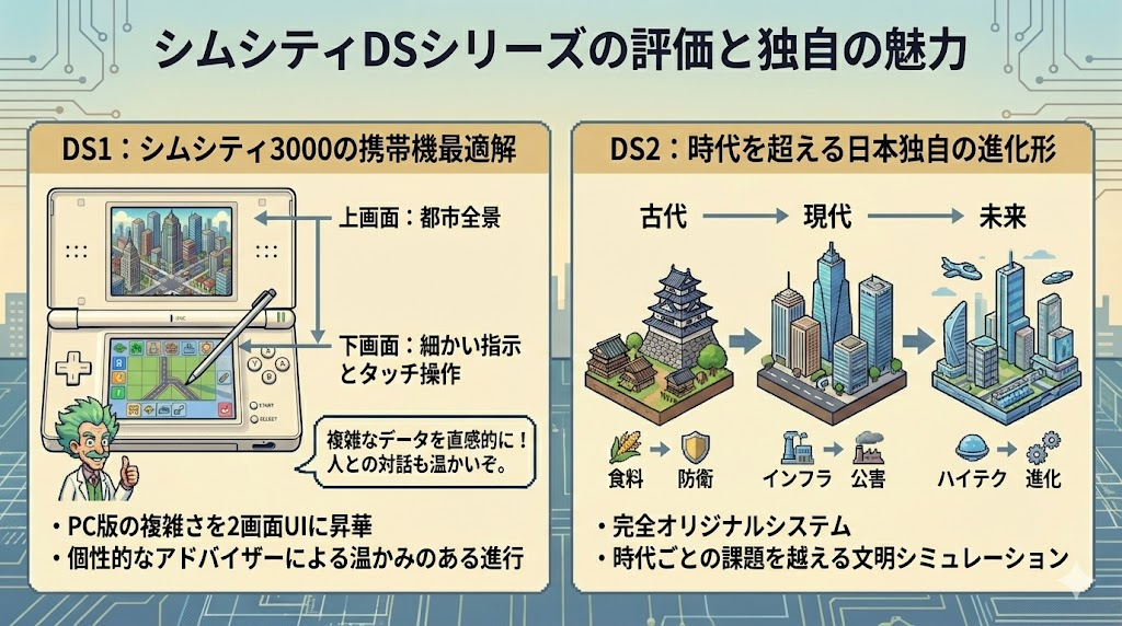 ニンテンドーDSで発売された『シムシティDS』シリーズは、PC版の移植にとどまらず、日本独自の「ガラパゴス的進化」を遂げた非常に興味深い作品です。